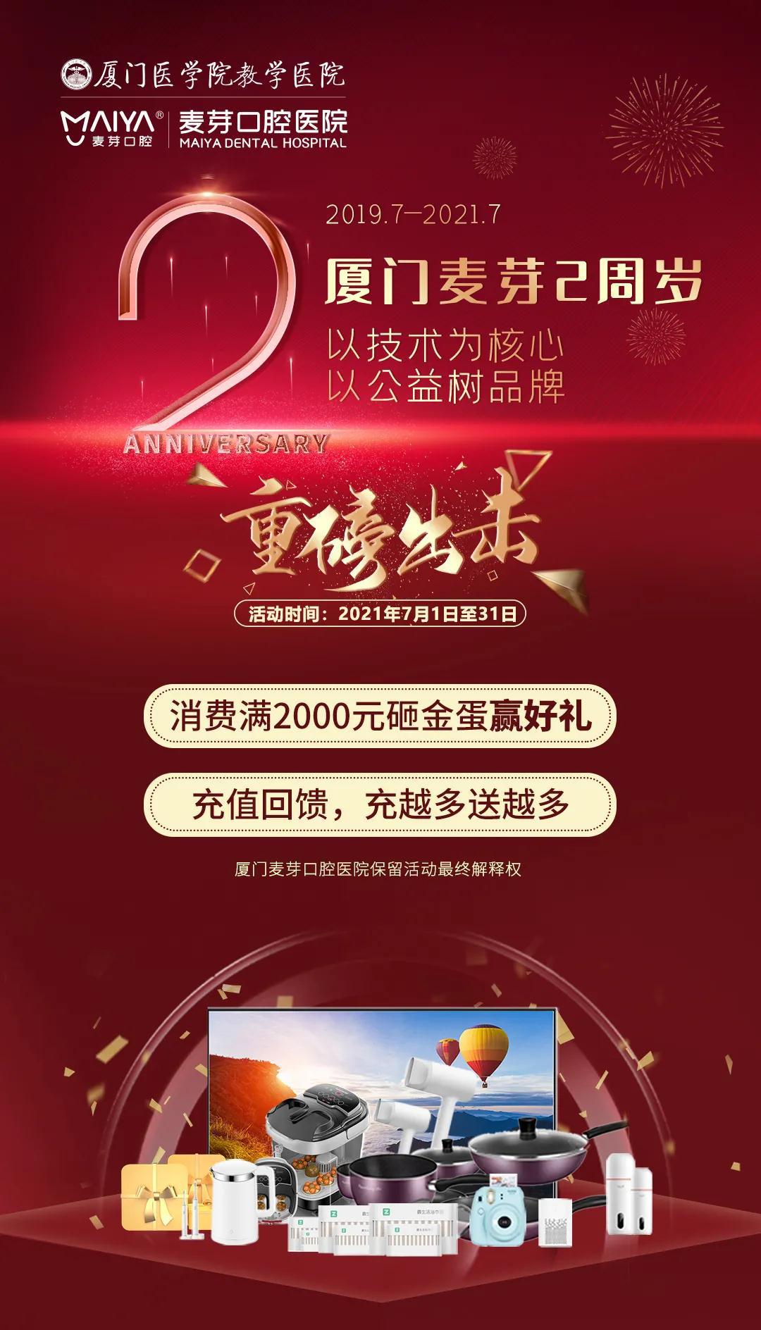 正值厦门麦芽口腔2周年庆啦!这里也是大家准备了丰厚的礼品,砸金蛋赢豪礼,充值越多送越多。