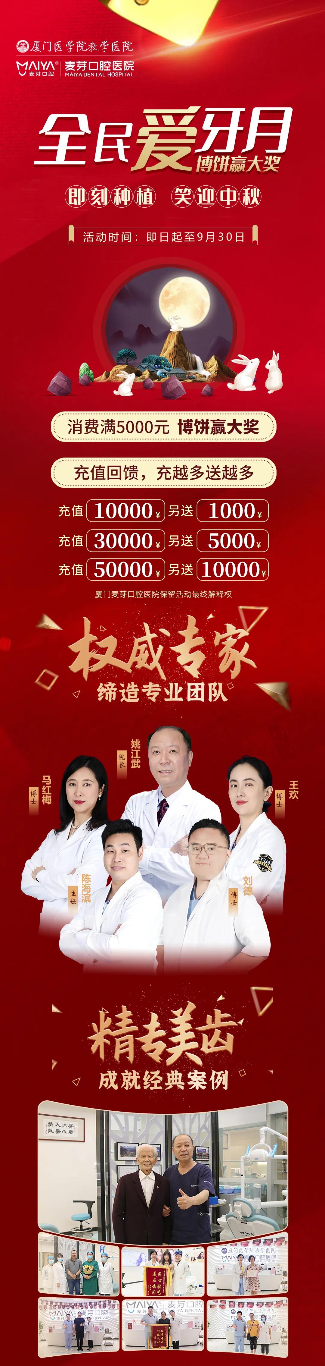 厦门麦芽口腔医院9月全民爱牙月,呼吁全民关爱口腔健康,才能全身健康,从小养成刷牙习惯,提高全民口腔健康保护意识。尤其是缺牙人群,需及时将缺牙补上。麦芽口腔数字化种植,种4颗恢复半口牙,当天种牙当天有牙,还可以参与博饼赢大奖。