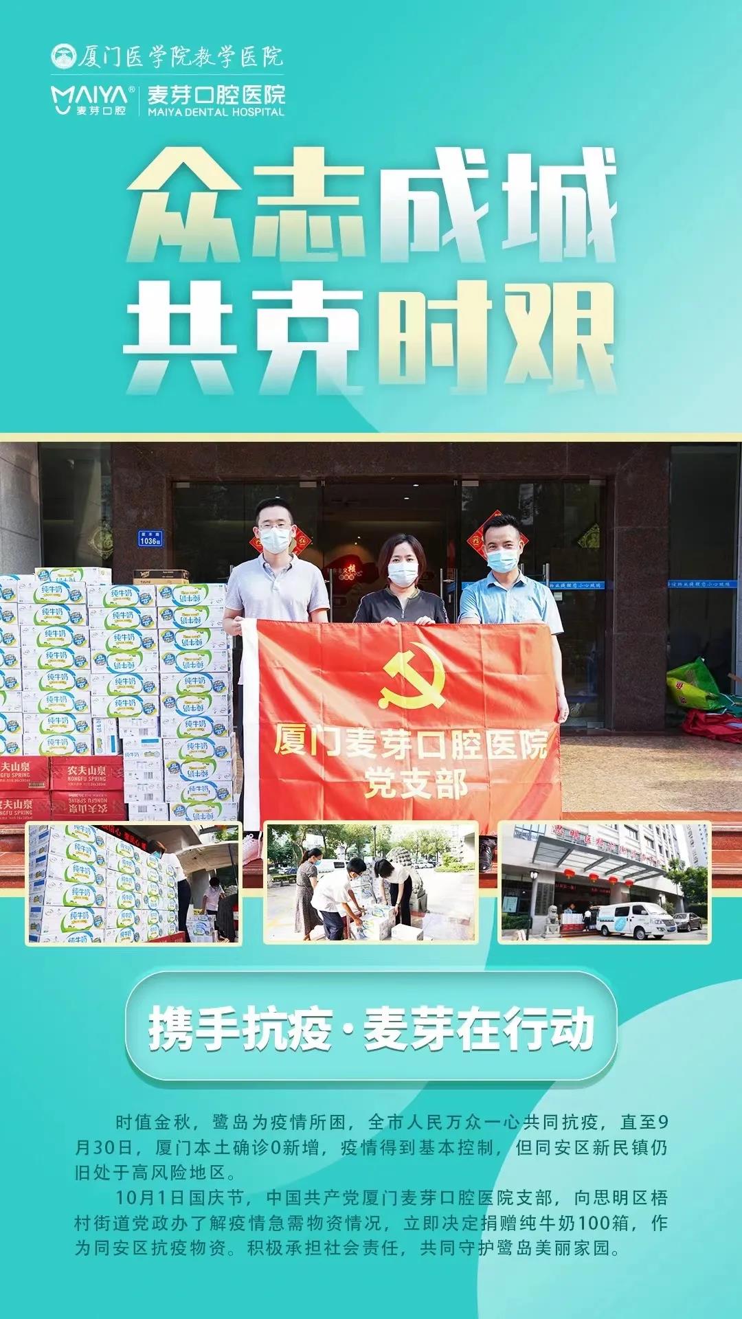 中国共产党厦门麦芽口腔医院党支部,向思明区梧村街道党政办了解疫情急需物资情况后,立即捐赠纯牛奶100箱,作为同安区抗疫物资,共同守护鹭岛美丽家园。