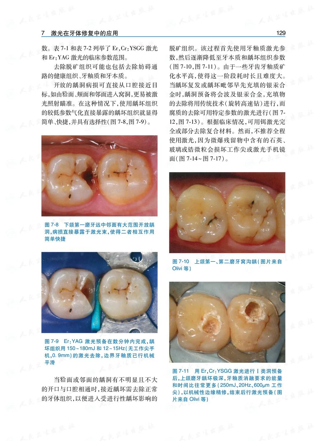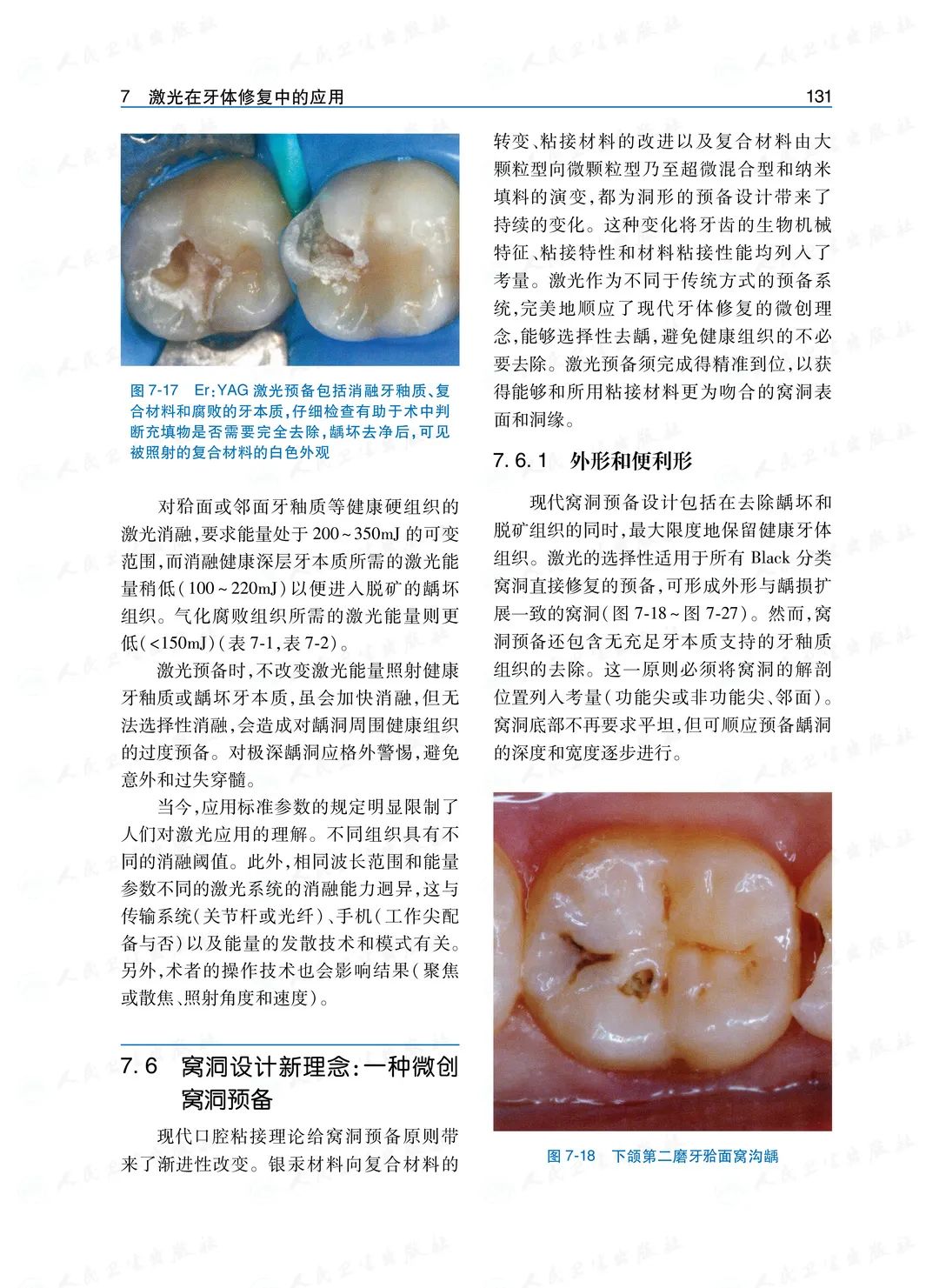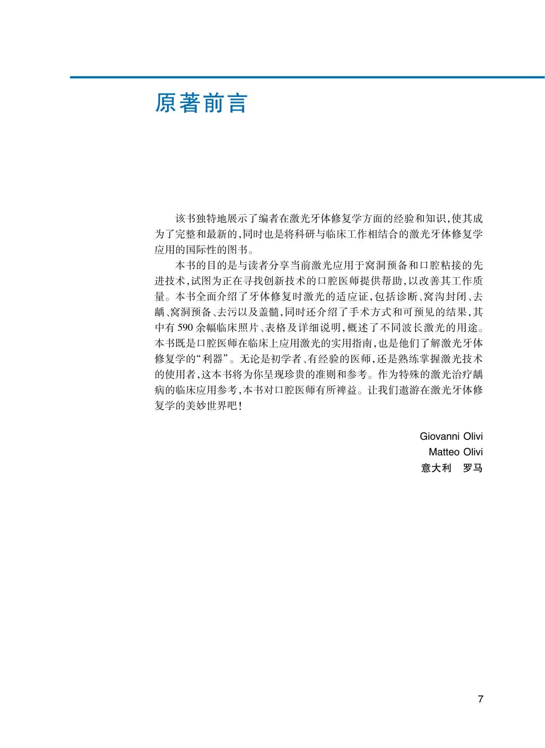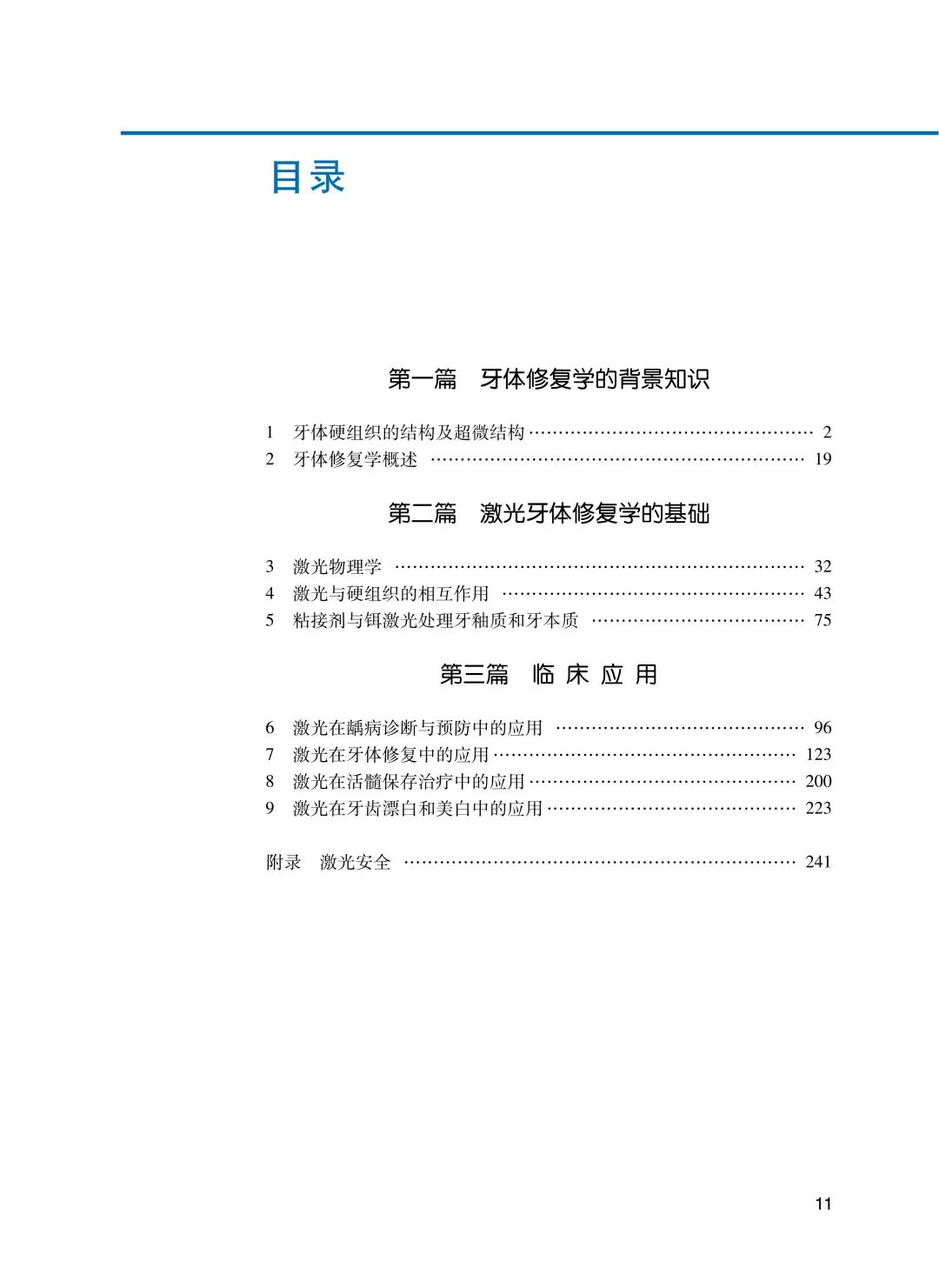 第三篇为临床应用,内容有激光在龋病诊断与预防中的应用、激光在牙体修复中的应用、激光在活髓保存治疗中的应用、激光在牙齿漂白和美白中的应用。在附录中,对激光临床应用的安全性进行了讨论。