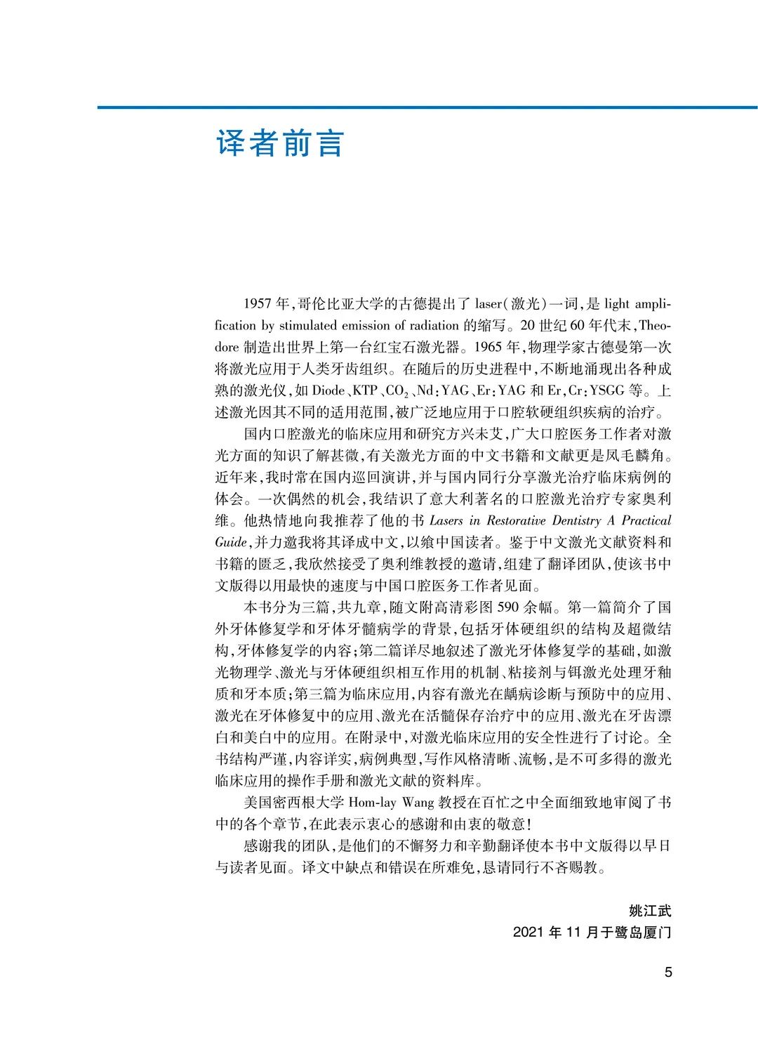 由著名口腔专家、厦门麦芽口腔医院院长姚江武主译的《激光牙体修复学临床指南》于2021年3月14日完成最后的清样审读工作,进入印刷环节,终于在2022年1月正式出版。